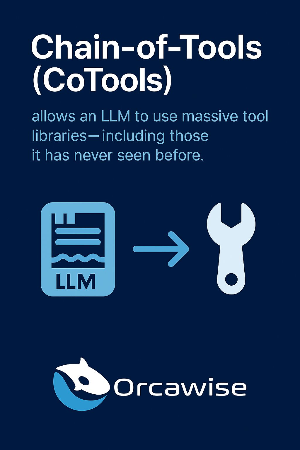 Chain-of-Tools (CoTools) lets an LLM use hundreds—even thousands—of tools, including ones it has never seen before, by reading simple natural language descriptions of each tool.